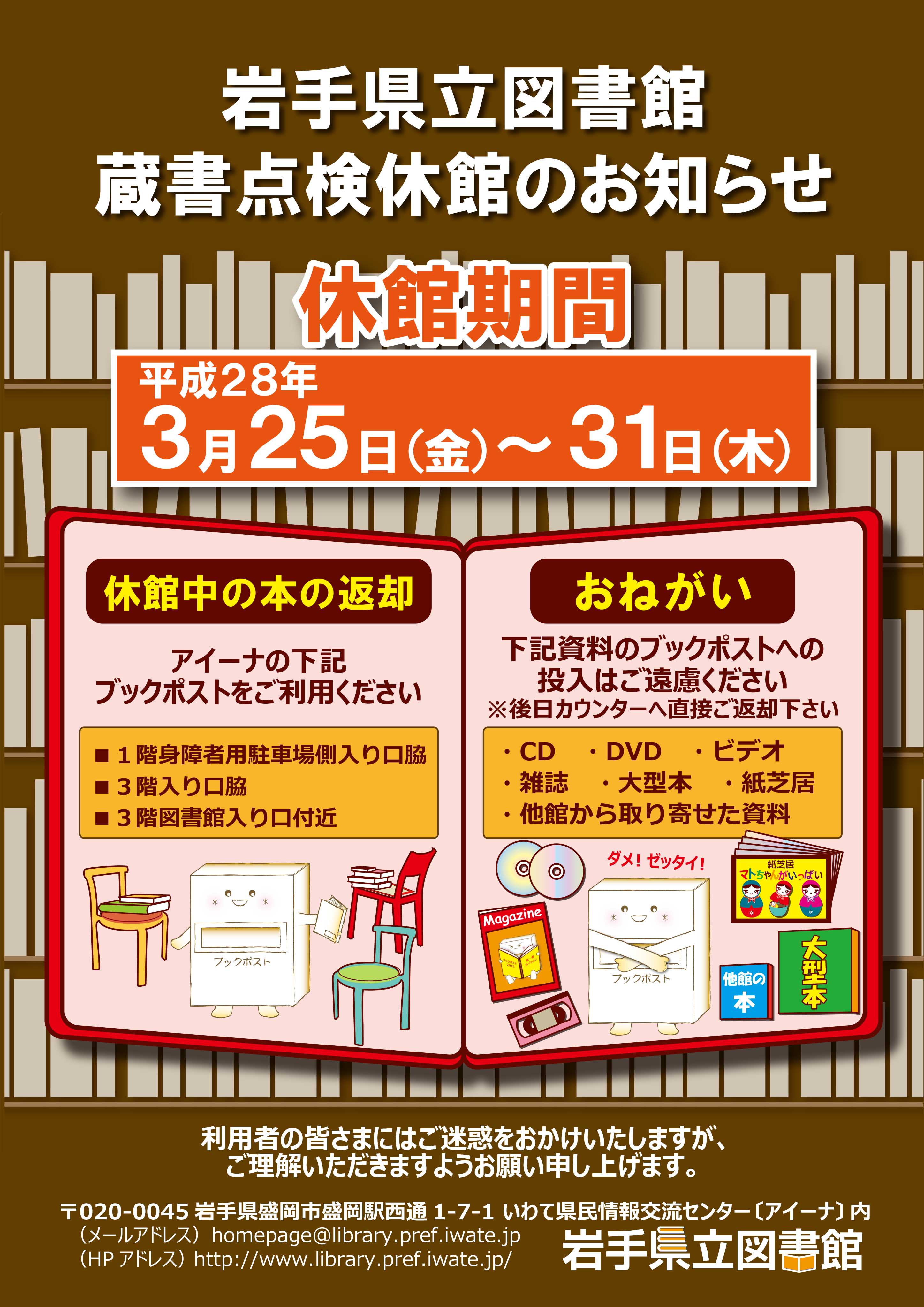 現在位置: トップページ > お知らせ・行事 > 図書館からのお知らせ > 蔵書点検休館のお知らせ