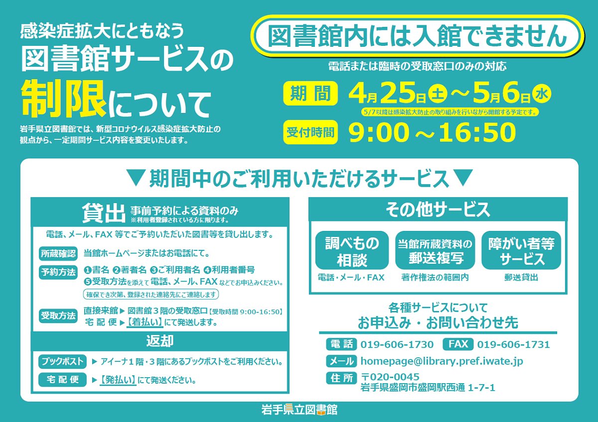 新型コロナウイルス感染症の拡大防止のため、岩手県立図書館では当面の間、以下のようにサービス内容を変更いたします。(図書館内には入館できません)