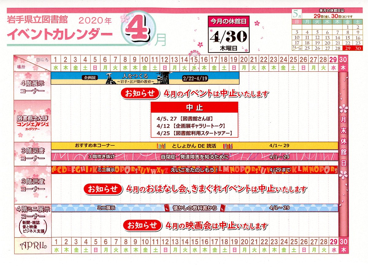 | 25日(土曜) | 新型コロナウイルス感染症拡大にともなう図書館サービスの制限について | ||