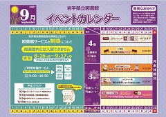 | 4日(土曜) | 9月4日(土曜)開催、岩手緊急事態宣言の実施にともなう図書館サービスの制限について | ||