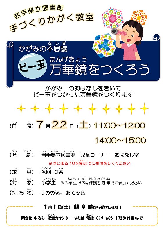 現在位置: トップページ > お知らせ・行事 > イベント情報 > 「夏休みてづくりかがく教室 ~かがみの不思議 ビー玉万華鏡をつくろう~」のお知らせ