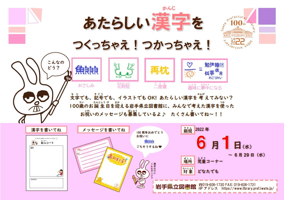 文字でも、記号でも、イラストでもOK! あたらしい漢字を考えてみない? 100歳のお誕生日を迎える岩手県立図書館に、みんなで考えた漢字を使ったお祝いのメッセージも募集しているよ♪たくさん書いてね!!