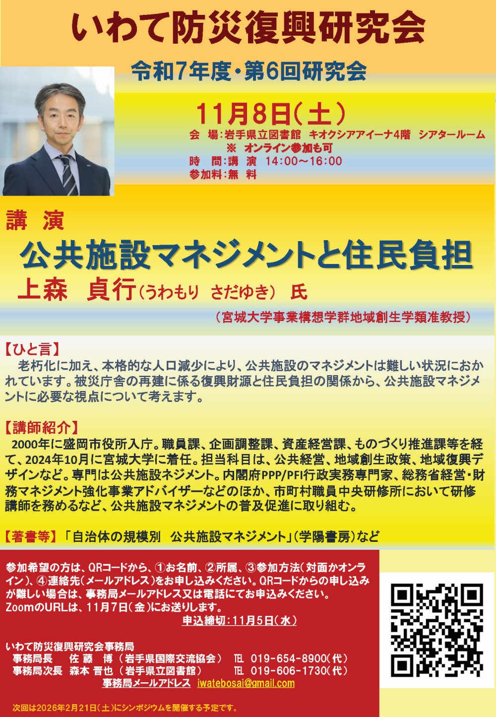 いわて防災復興研究会 令和7年度第6回研究会が、岩手県立図書館ミニシアターを会場に開催されます。