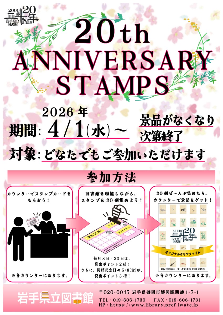 岩手県立図書館の移転開館20周年を記念し、スタンプを20個集めてステキな景品が貰えるイベントを開催します。スタンプを集めながら、図書館を大いに堪能しちゃいましょう!